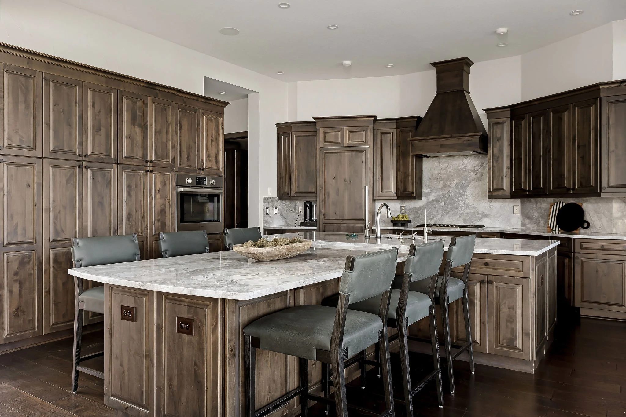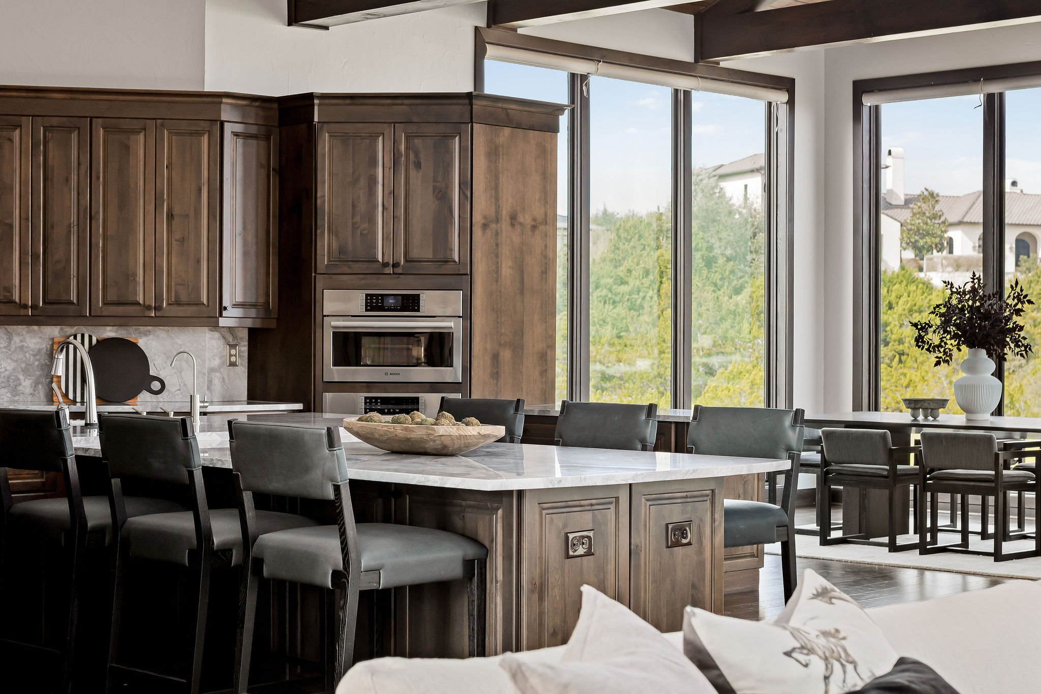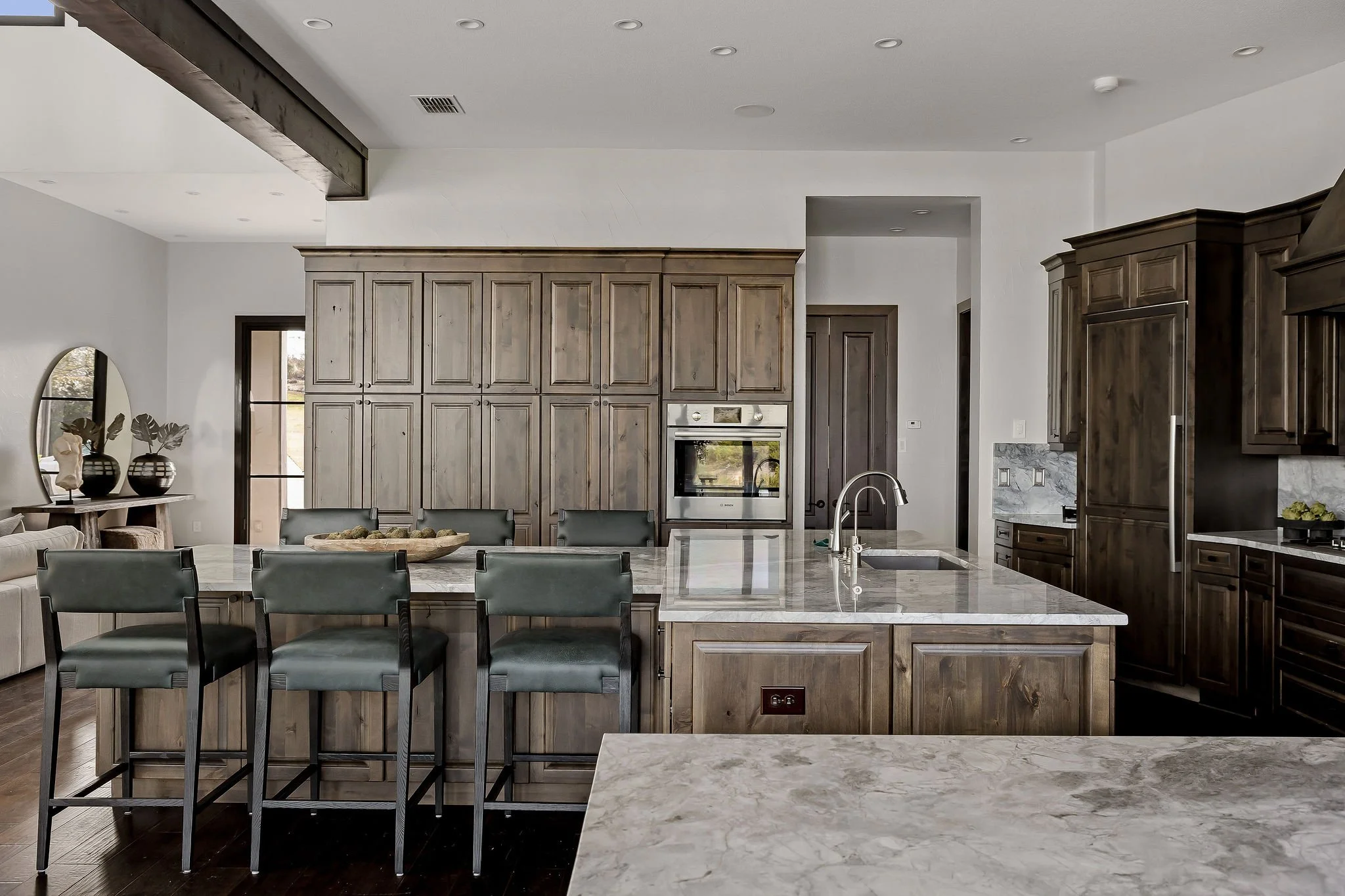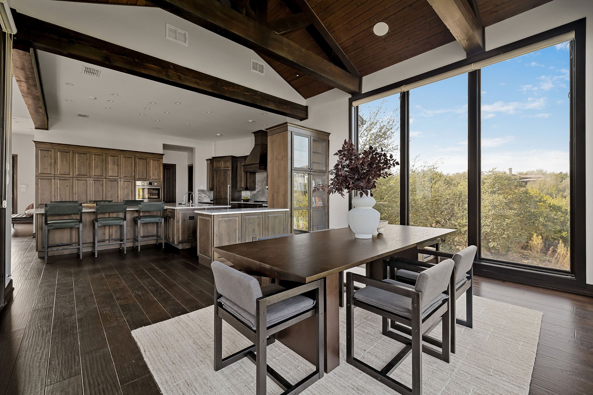 A dramatic arrival unfolds through grand double doors into soaring cathedral ceilings framed by Douglas fir beams and expansive floor-to-ceiling windows. Stone, metal, and rich natural woods create a refined palette that feels timeless, grounded, and quietly luxurious. Designed for both grand entertaining and everyday ease, the kitchen is beautifully appointed with custom knotty alder cabinetry, natural stone surfaces, professional Thermador appliances, and a fully equipped butlerβs pantry and wine room. Multiple living and gathering spaces flow seamlessly throughout the home, including a sunroom wrapped in glass, a sophisticated library, media room, and inviting secondary suites. The ownerβs retreat is a sanctuary unto itself, featuring exquisite architectural detailing, a fireplace, and a spa-inspired bath with a multi-function Roman shower designed for complete relaxation.