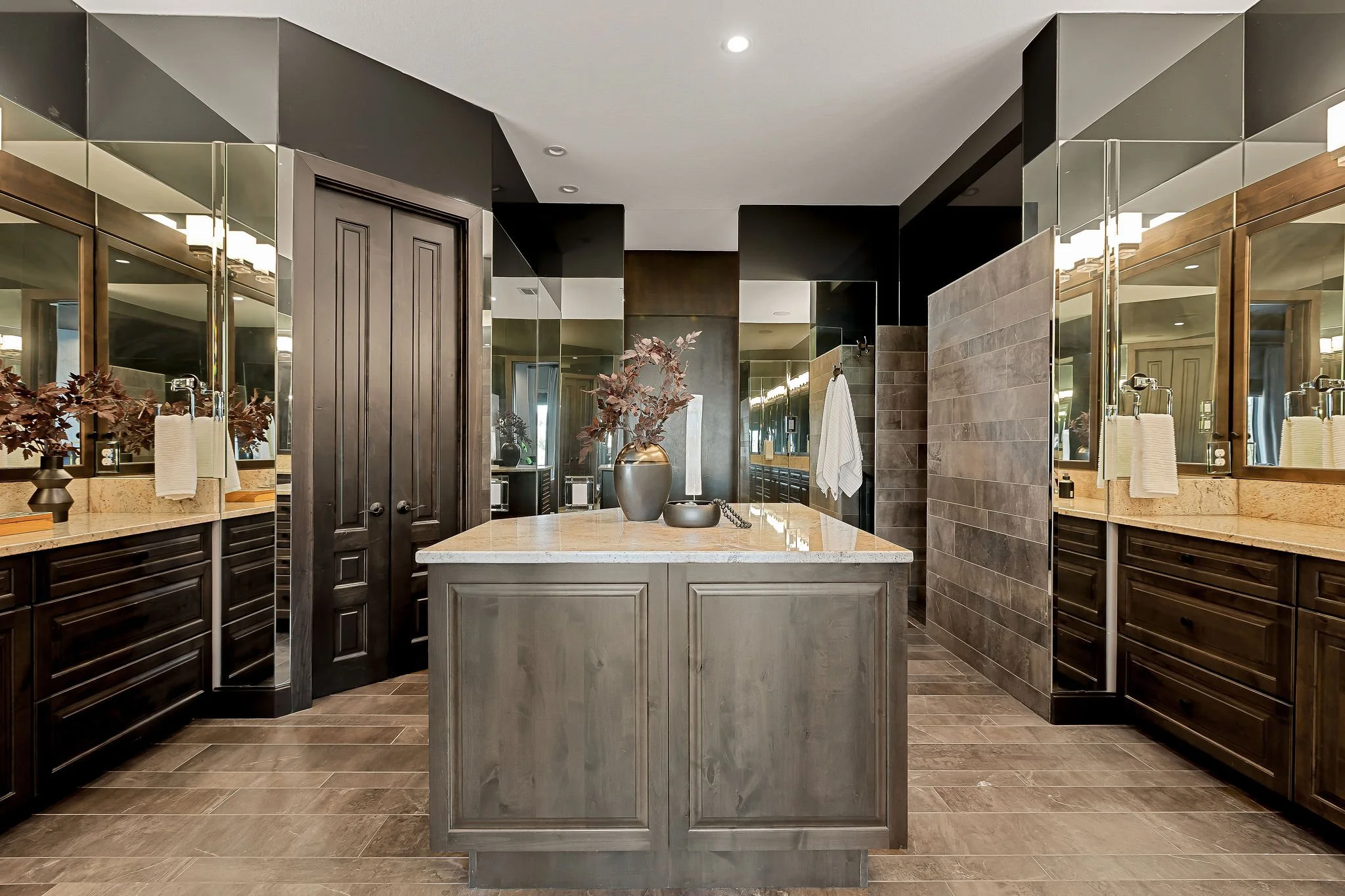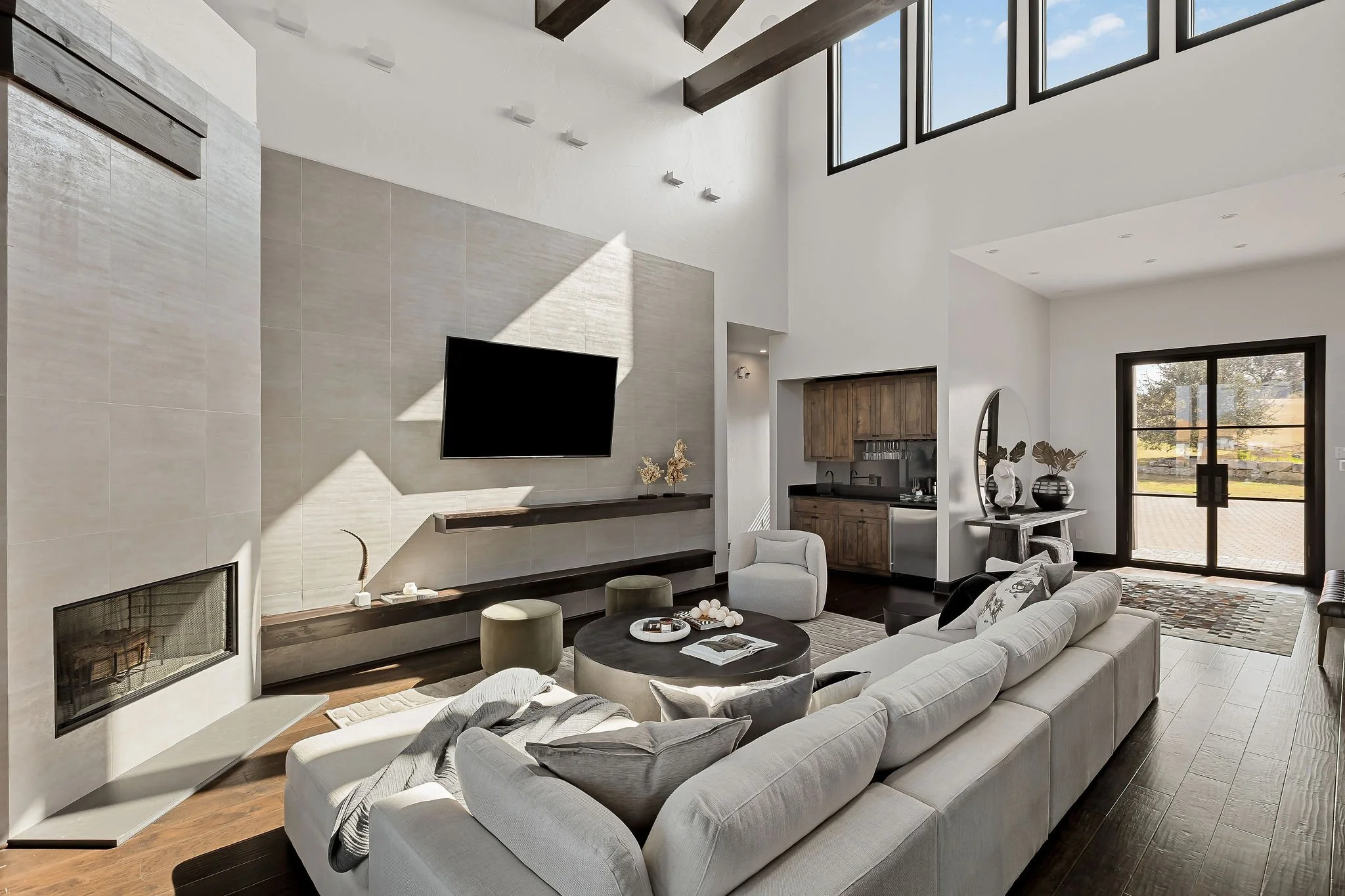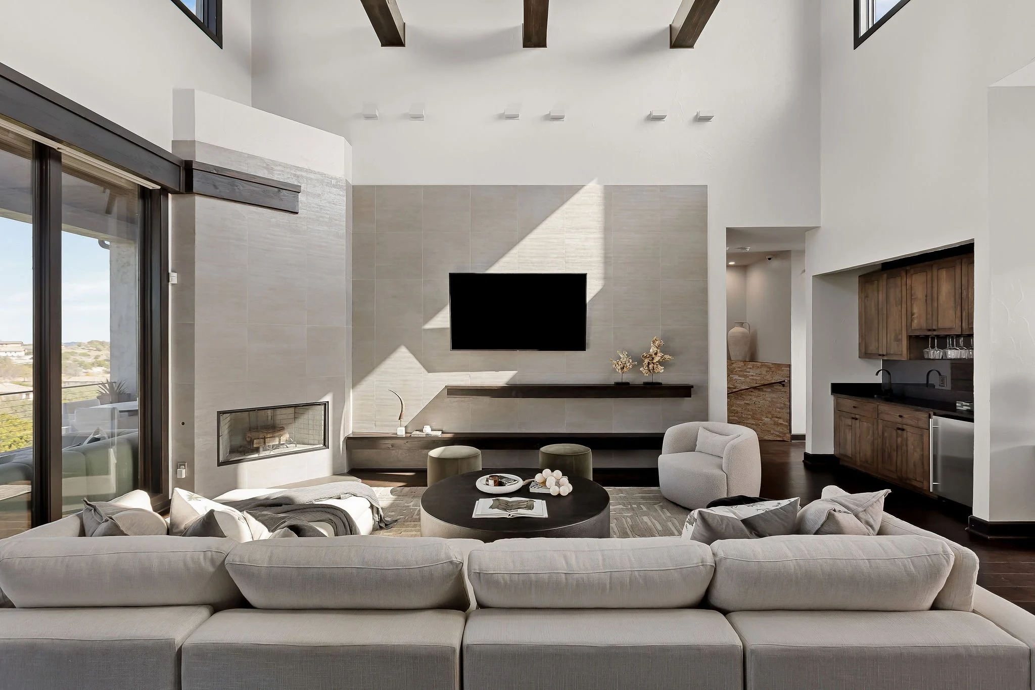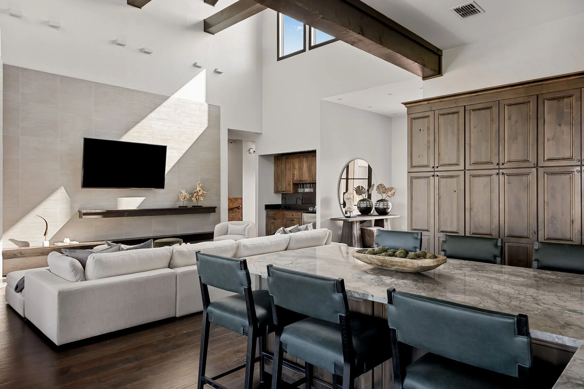 A dramatic arrival unfolds through grand double doors into soaring cathedral ceilings framed by Douglas fir beams and expansive floor-to-ceiling windows. Stone, metal, and rich natural woods create a refined palette that feels timeless, grounded, and quietly luxurious. Designed for both grand entertaining and everyday ease, the kitchen is beautifully appointed with custom knotty alder cabinetry, natural stone surfaces, professional Thermador appliances, and a fully equipped butlerβs pantry and wine room. Multiple living and gathering spaces flow seamlessly throughout the home, including a sunroom wrapped in glass, a sophisticated library, media room, and inviting secondary suites. The ownerβs retreat is a sanctuary unto itself, featuring exquisite architectural detailing, a fireplace, and a spa-inspired bath with a multi-function Roman shower designed for complete relaxation.