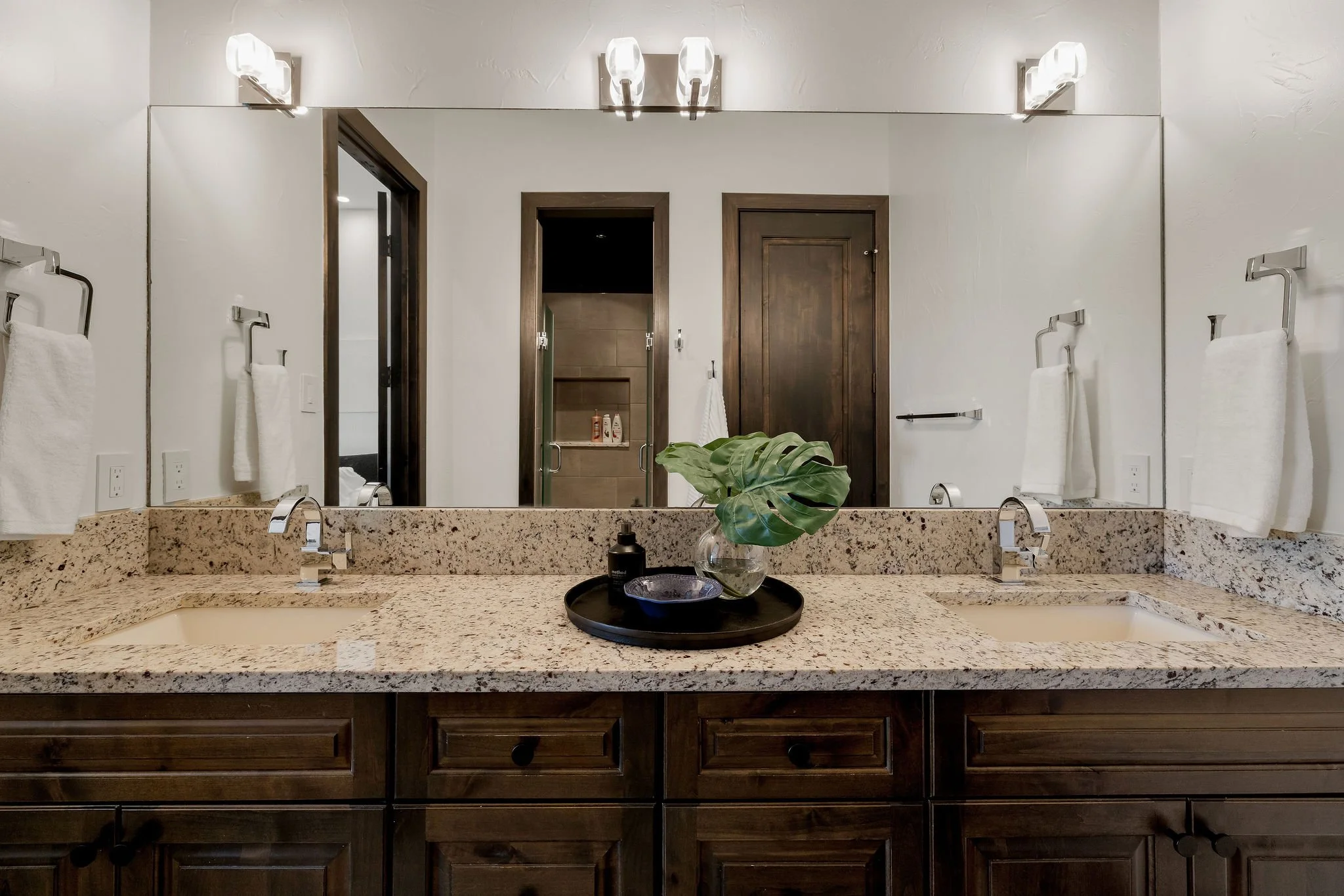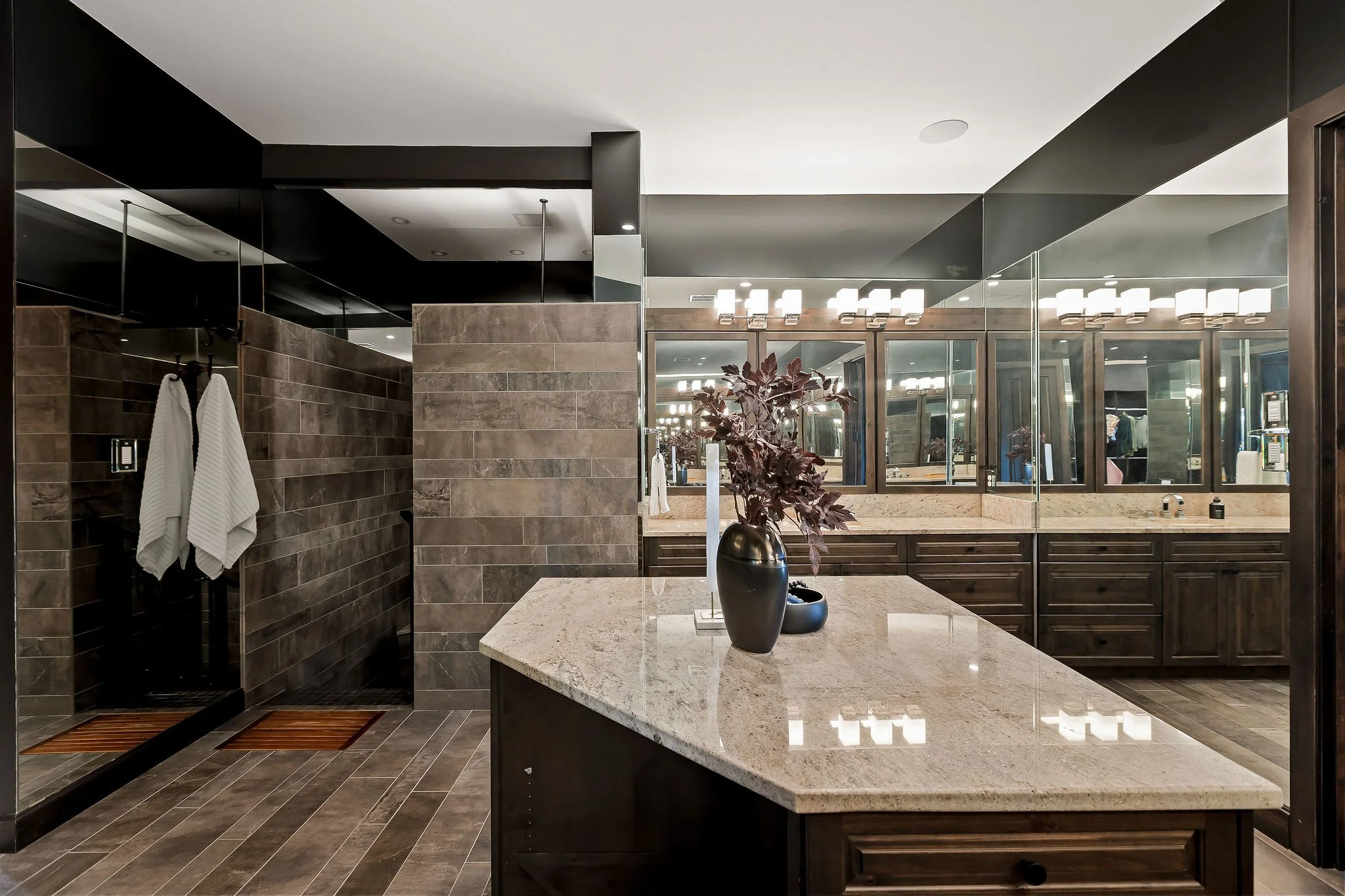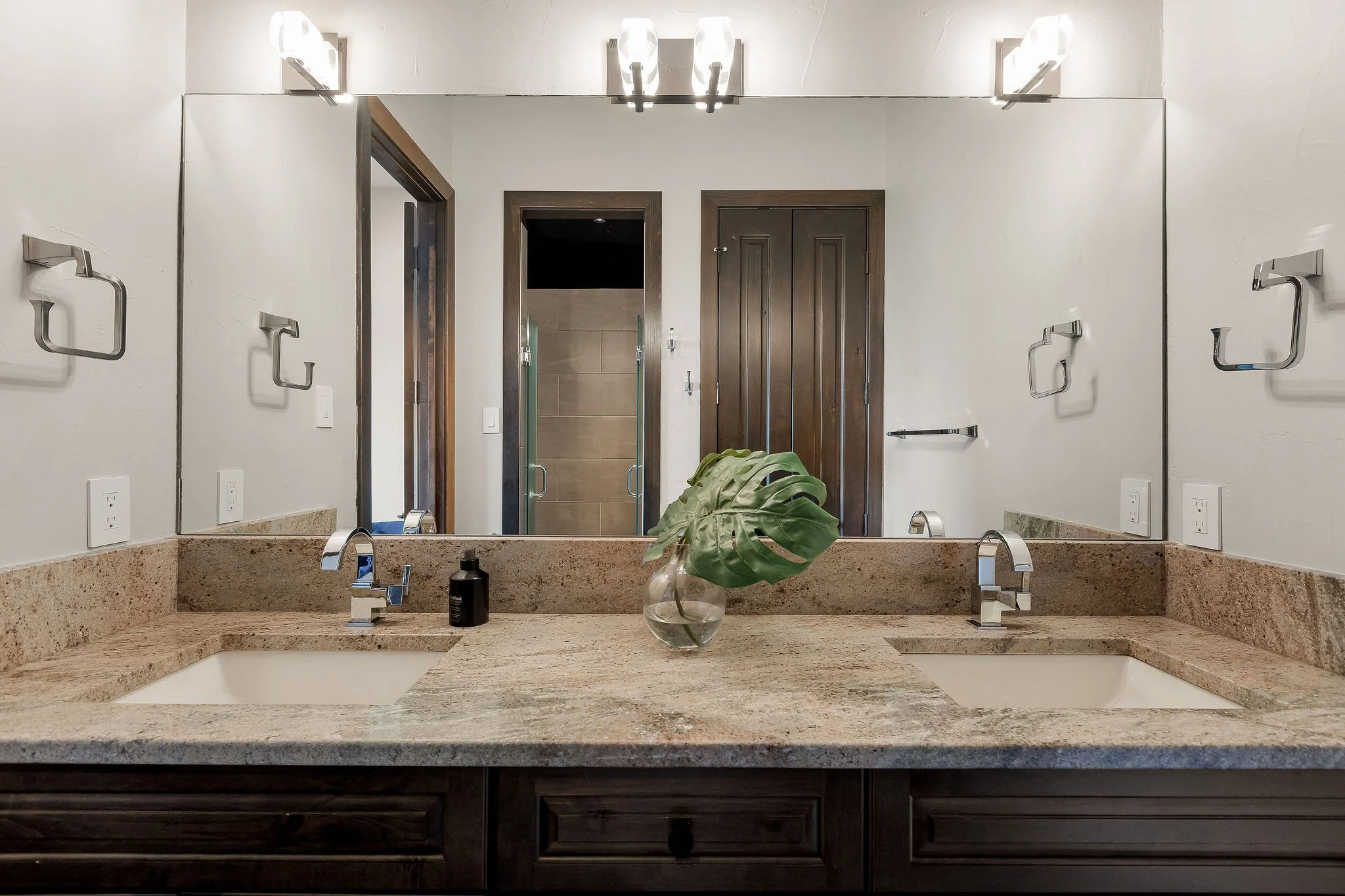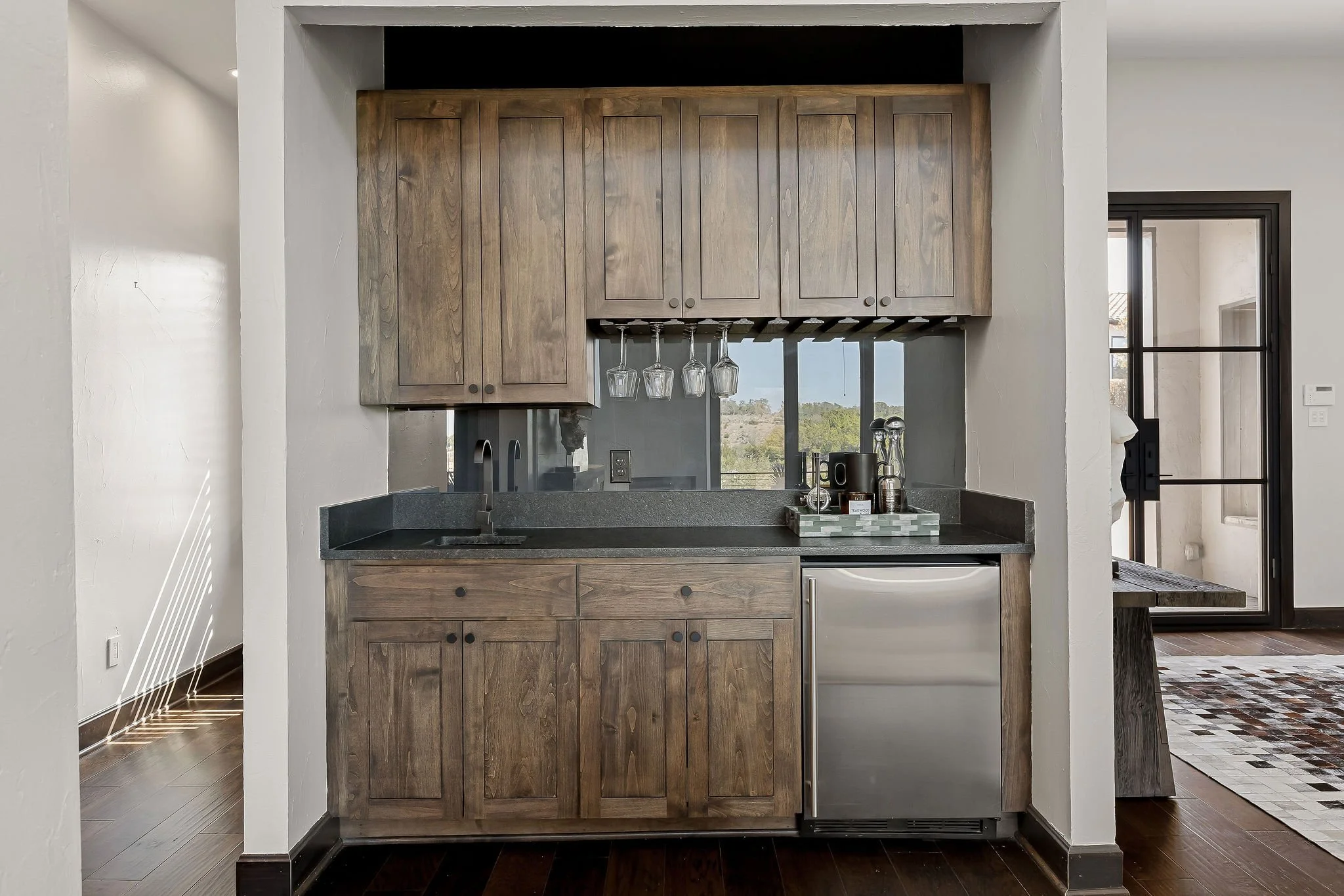 A dramatic arrival unfolds through grand double doors into soaring cathedral ceilings framed by Douglas fir beams and expansive floor-to-ceiling windows. Stone, metal, and rich natural woods create a refined palette that feels timeless, grounded, and quietly luxurious. Designed for both grand entertaining and everyday ease, the kitchen is beautifully appointed with custom knotty alder cabinetry, natural stone surfaces, professional Thermador appliances, and a fully equipped butlerβs pantry and wine room. Multiple living and gathering spaces flow seamlessly throughout the home, including a sunroom wrapped in glass, a sophisticated library, media room, and inviting secondary suites. The ownerβs retreat is a sanctuary unto itself, featuring exquisite architectural detailing, a fireplace, and a spa-inspired bath with a multi-function Roman shower designed for complete relaxation.
