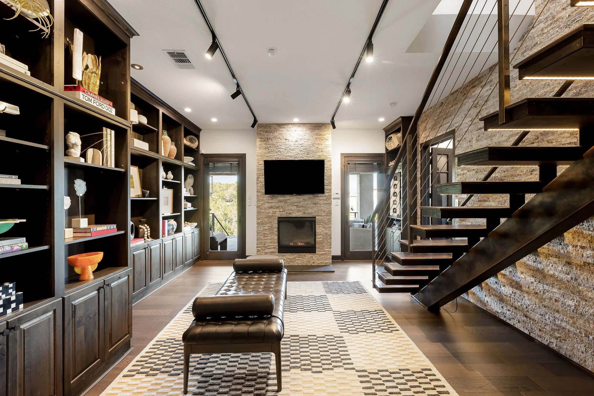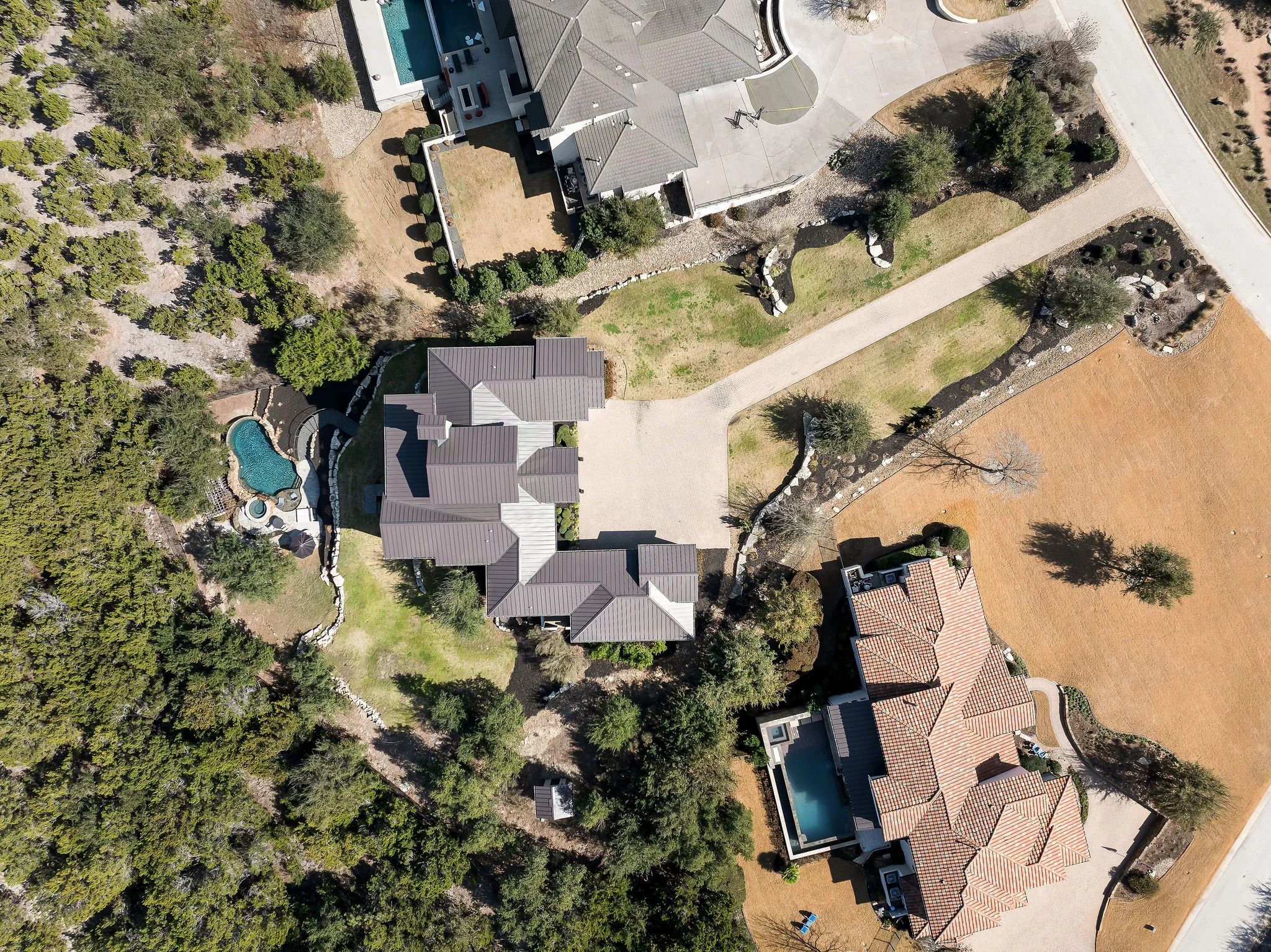 Outdoors, the estate unfolds into a private resort experience. Terraced decks and expansive entertaining areas overlook a dramatic pool grotto with waterfall, heated spa, and beautifully landscaped grounds, all framed by panoramic Hill Country views. Whether hosting under the stars or enjoying quiet mornings above the valley, the setting is simply unforgettable.