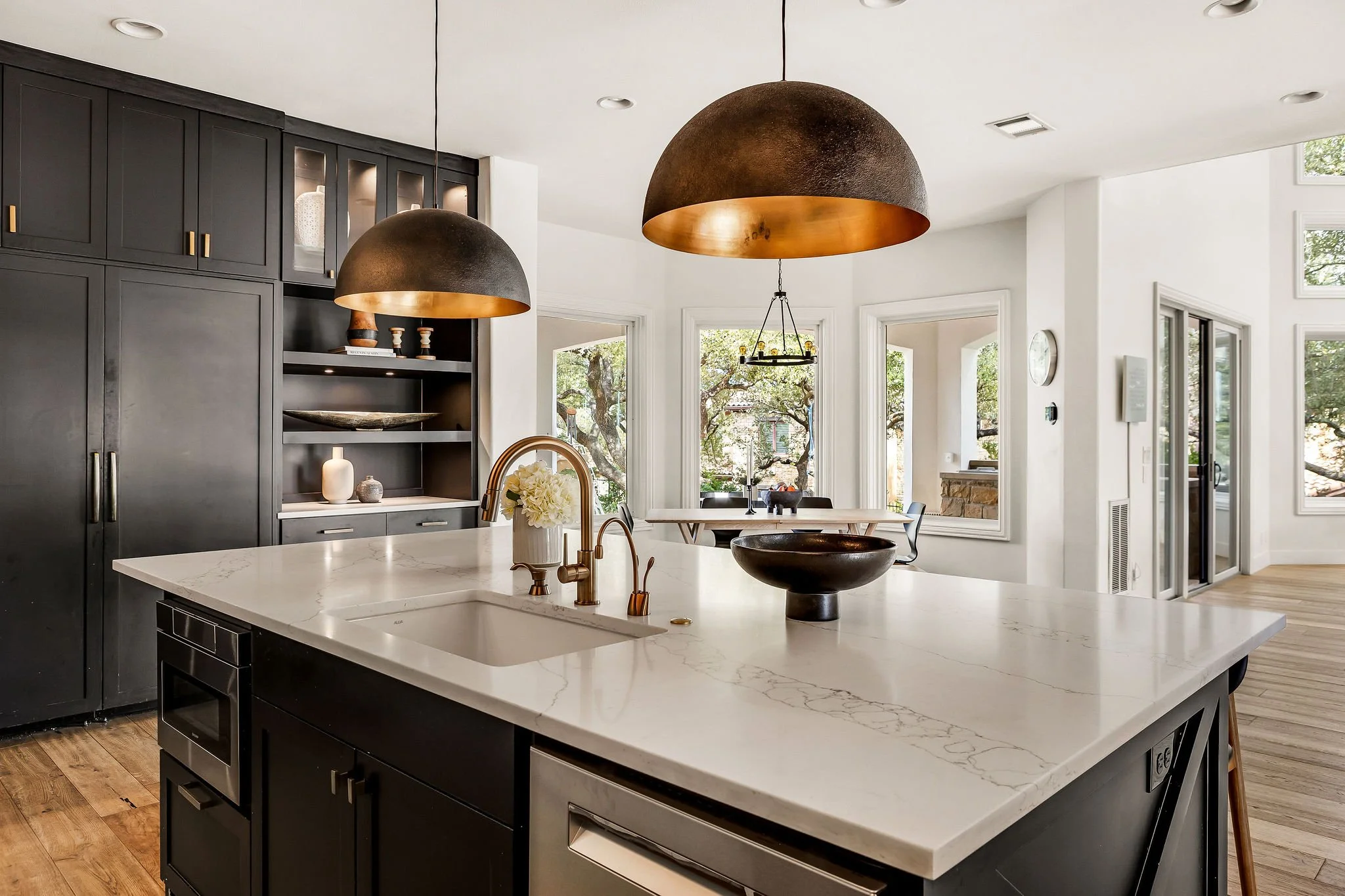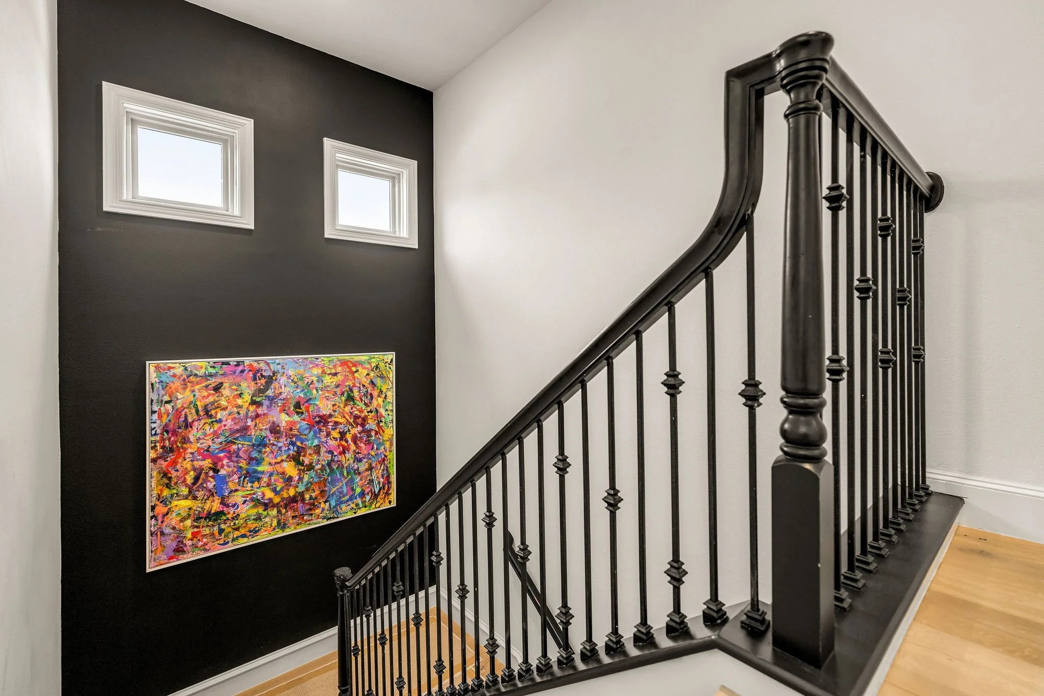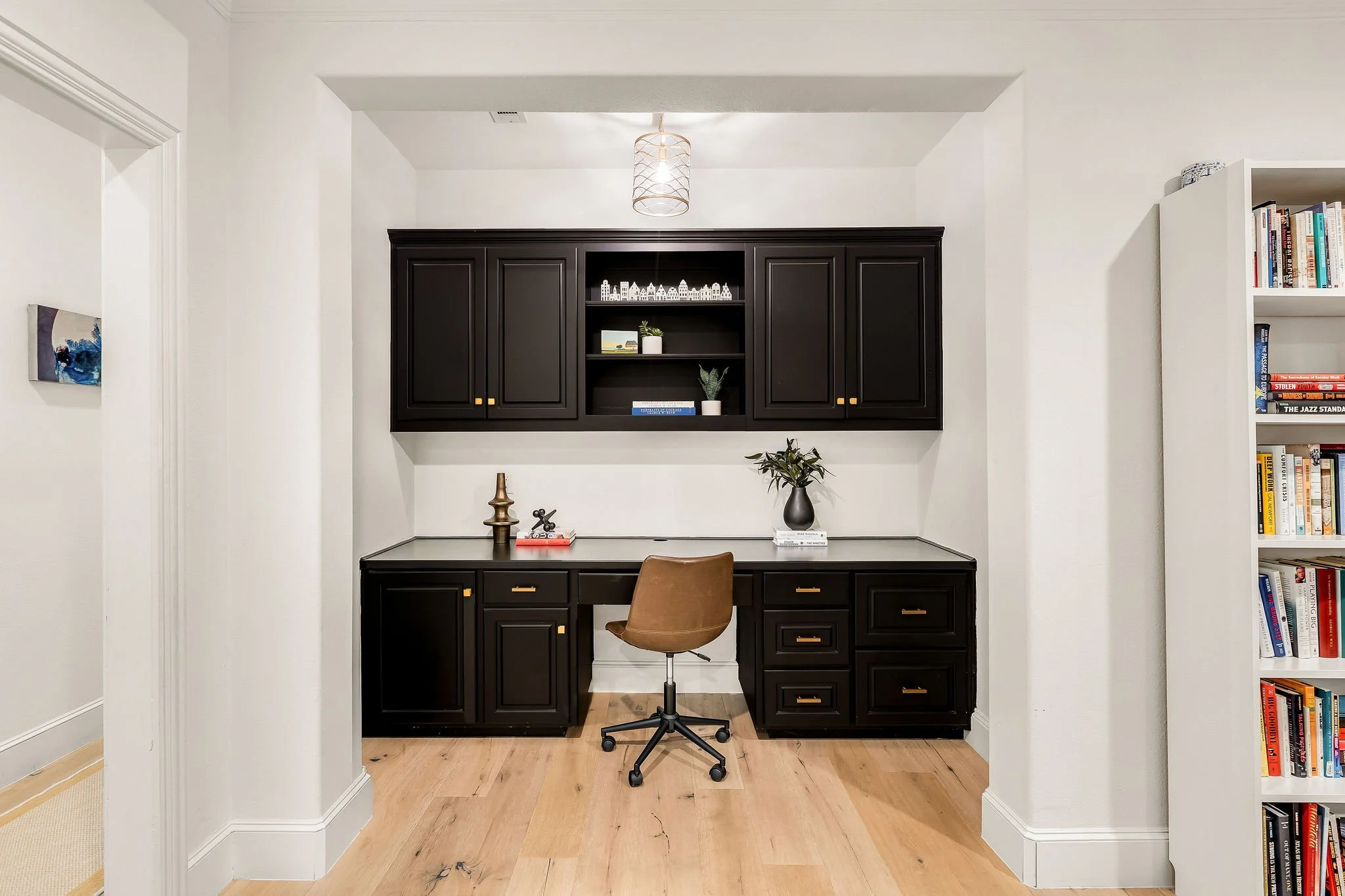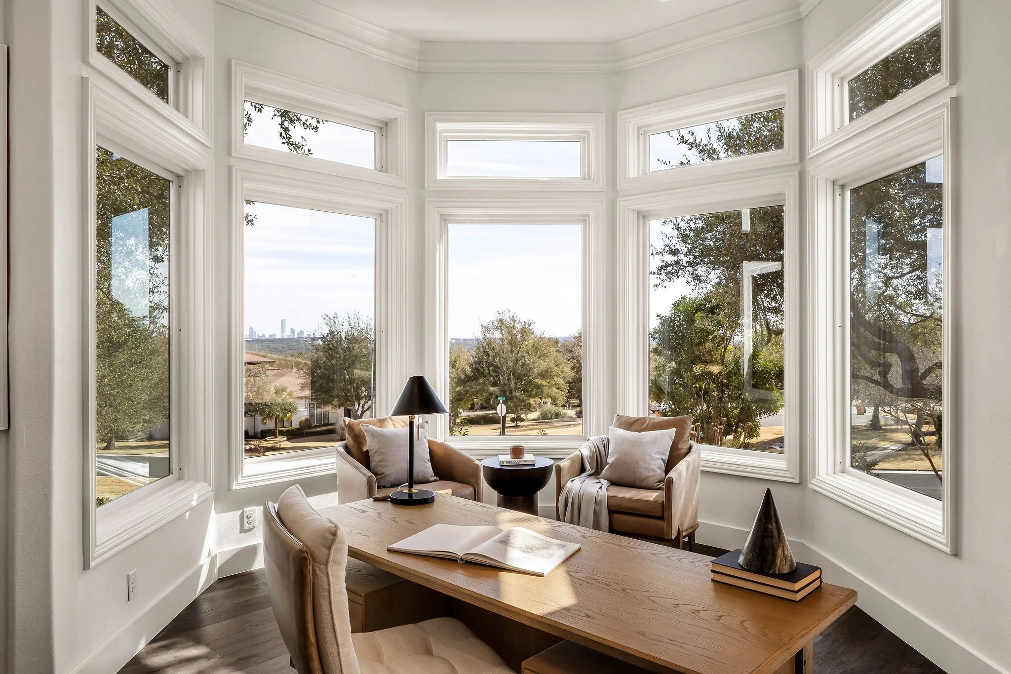 The main level includes a dedicated office with updated flooring and a new window, filling the space with natural light and framing downtown views. The primary suite is conveniently located on the main floor, while the open-concept kitchen anchors the home with quartz countertops and seamless flow into the surrounding living spaces.
