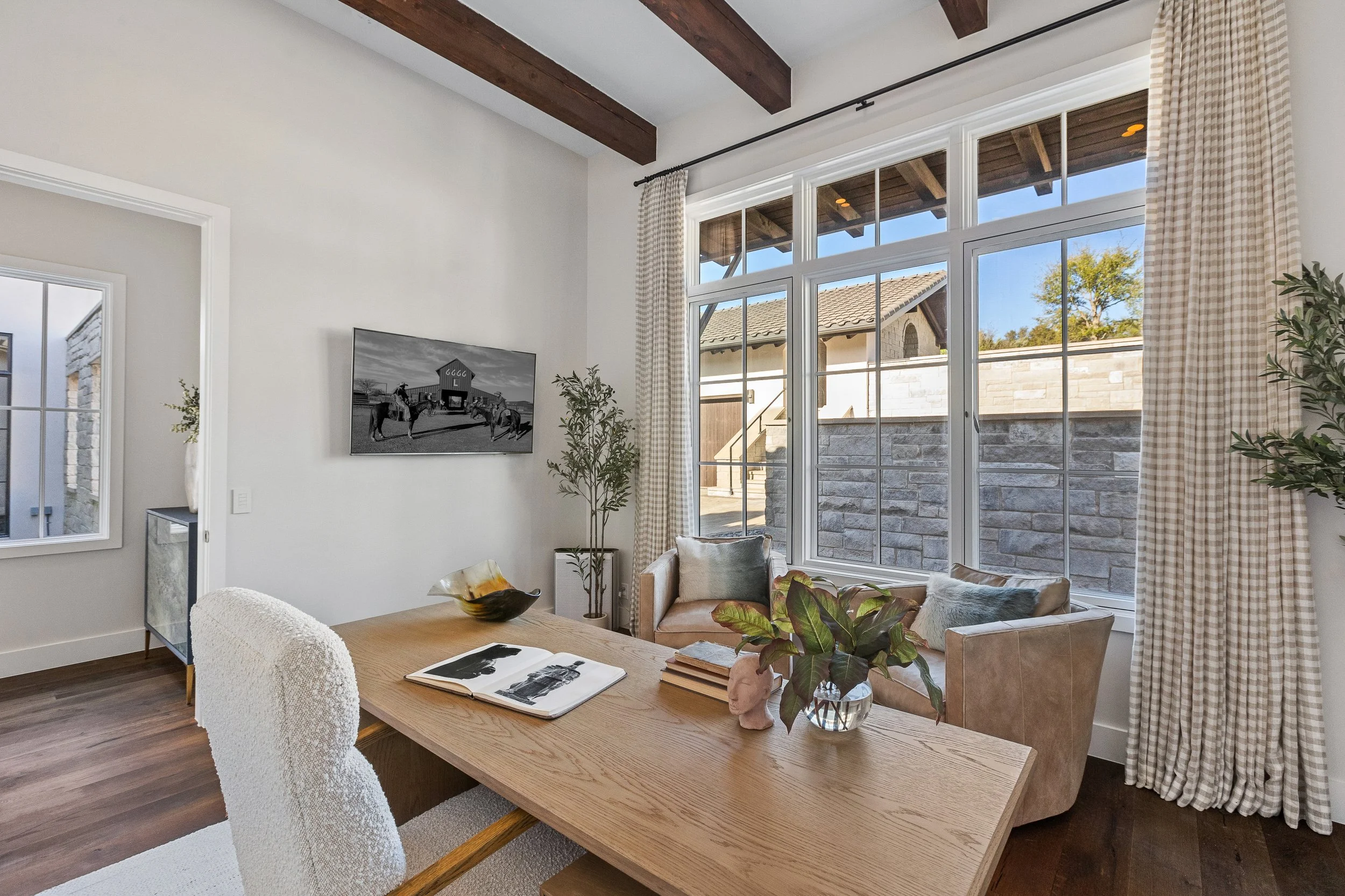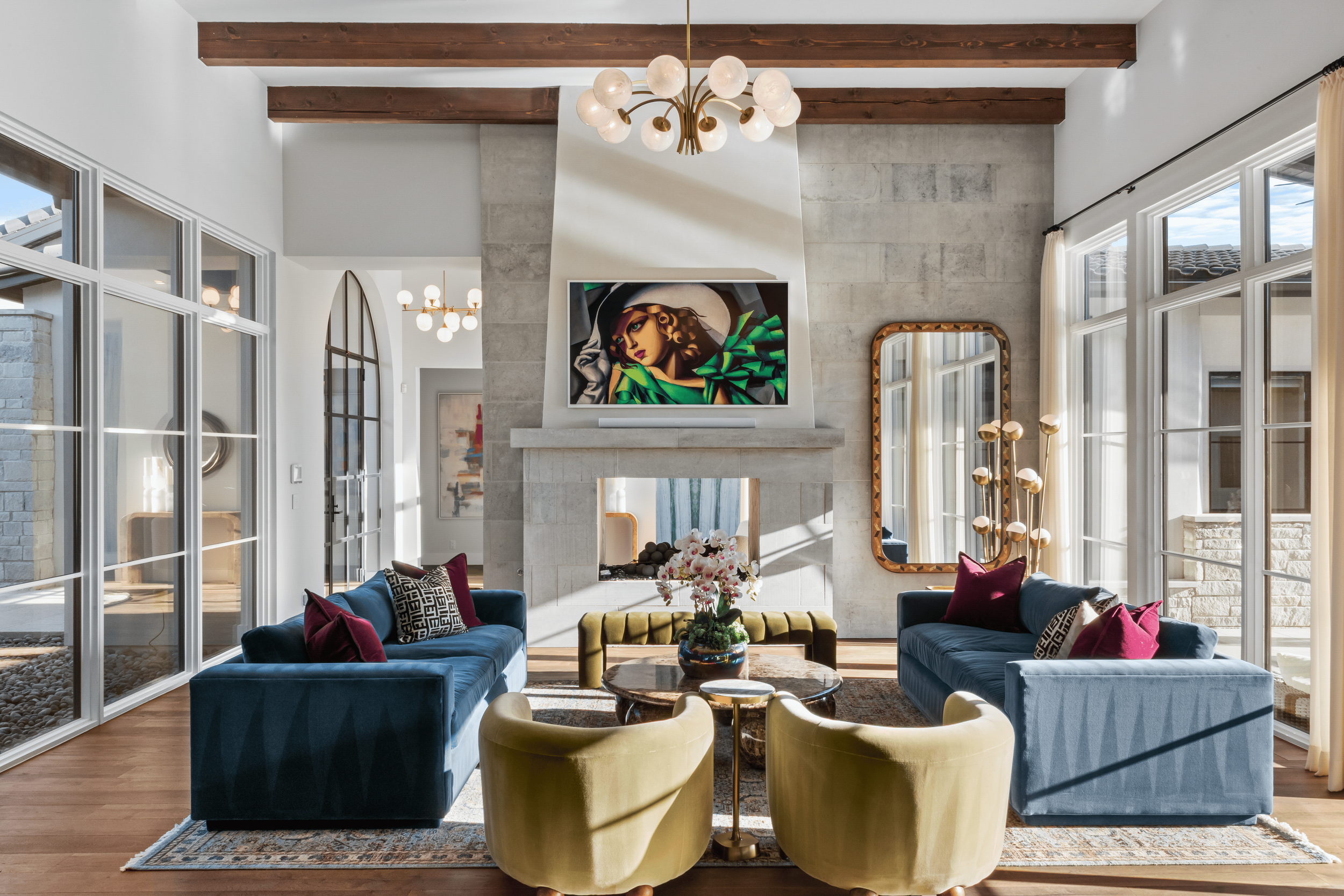 Tucked behind the gates of Spanish Oaks and backing to the 12th green — a distinction no other home in the community can claim — this extraordinary estate is a rare blend of elevated design, privacy, and resort-caliber serenity. Set on just over an acre, the home unfolds with striking architecture and beautifully curated interiors, where arched steel-and-glass entry doors, soaring beamed ceilings, rich wood floors, walls of windows, and statement lighting create a sense of warmth, scale, and sophistication throughout.