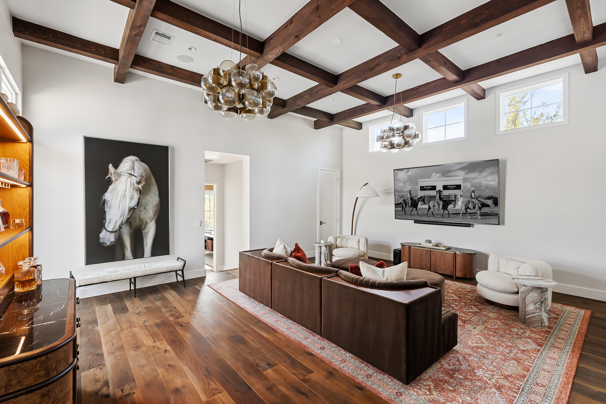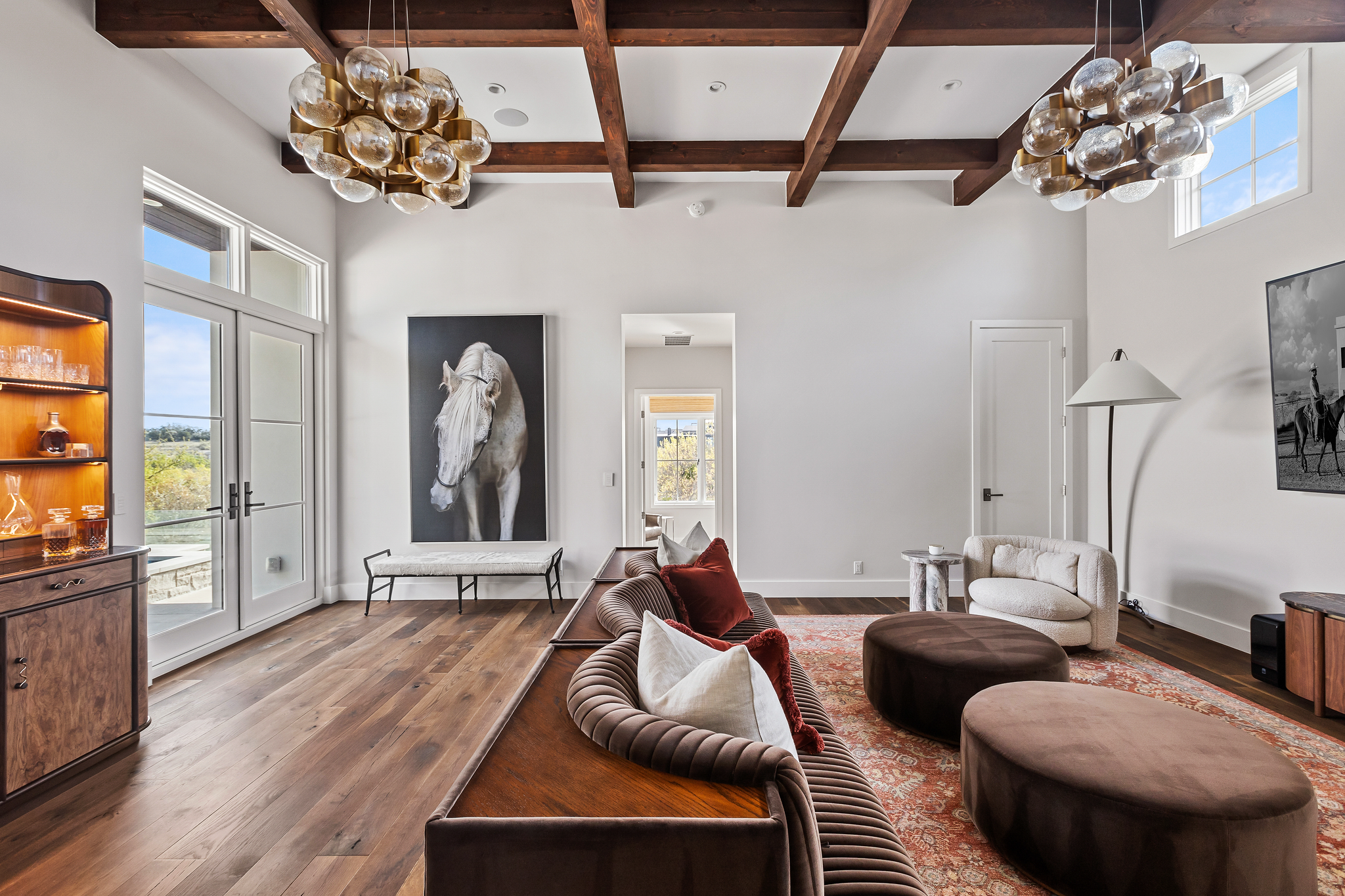 Designed for both refined entertaining and everyday ease, the main living spaces flow effortlessly from a dramatic great room to a stunning chef's kitchen with an oversized island, custom cabinetry, and an elegant dining area framed by views of the grounds beyond. The primary suite feels like a true retreat, complete with a spa-inspired bath, generous dressing space, and a quiet, restorative feel that carries throughout the home. Multiple living areas, beautifully appointed secondary bedrooms, and thoughtfully designed spaces offer flexibility for guests, work, wellness, and leisure.