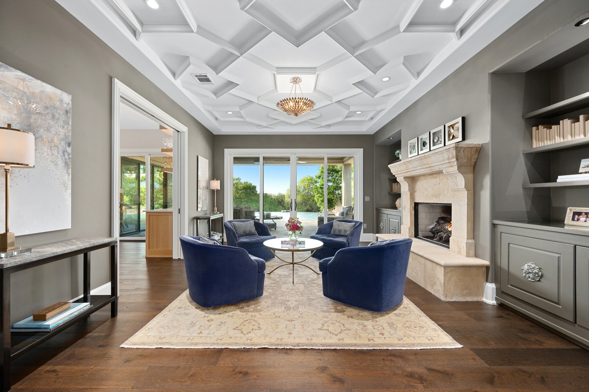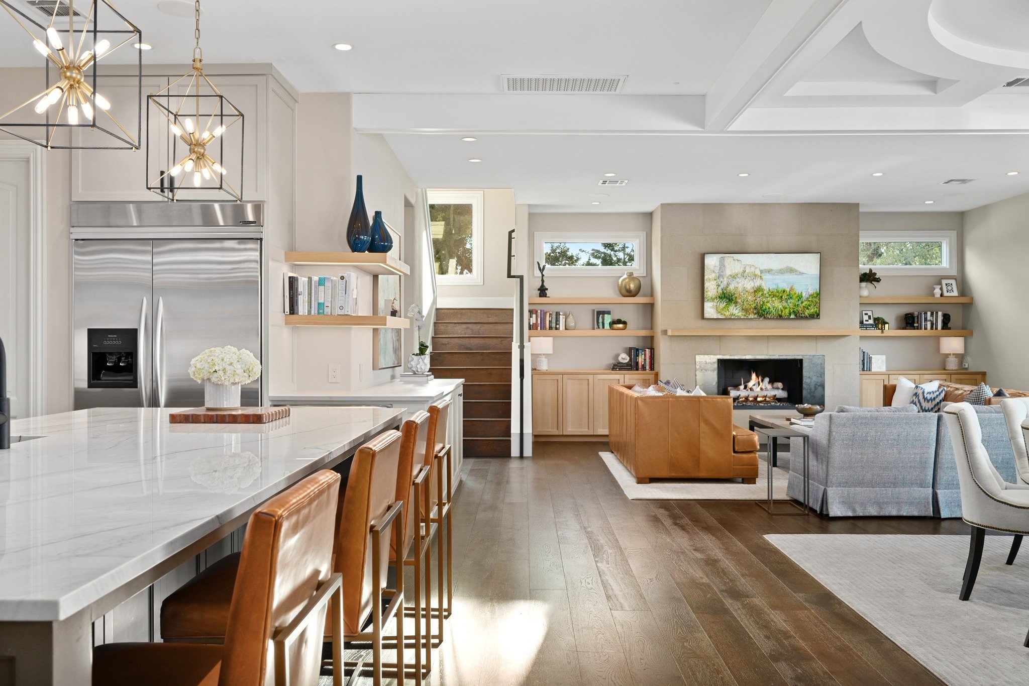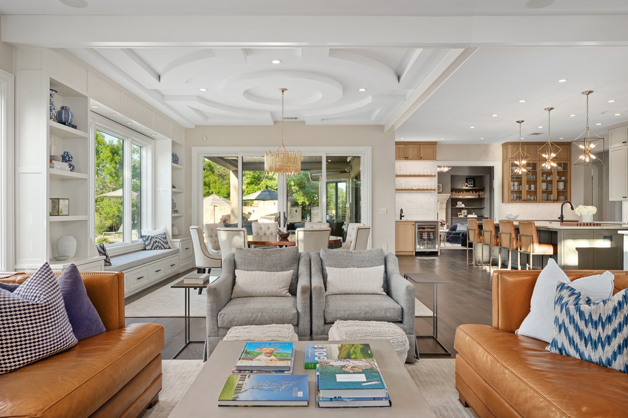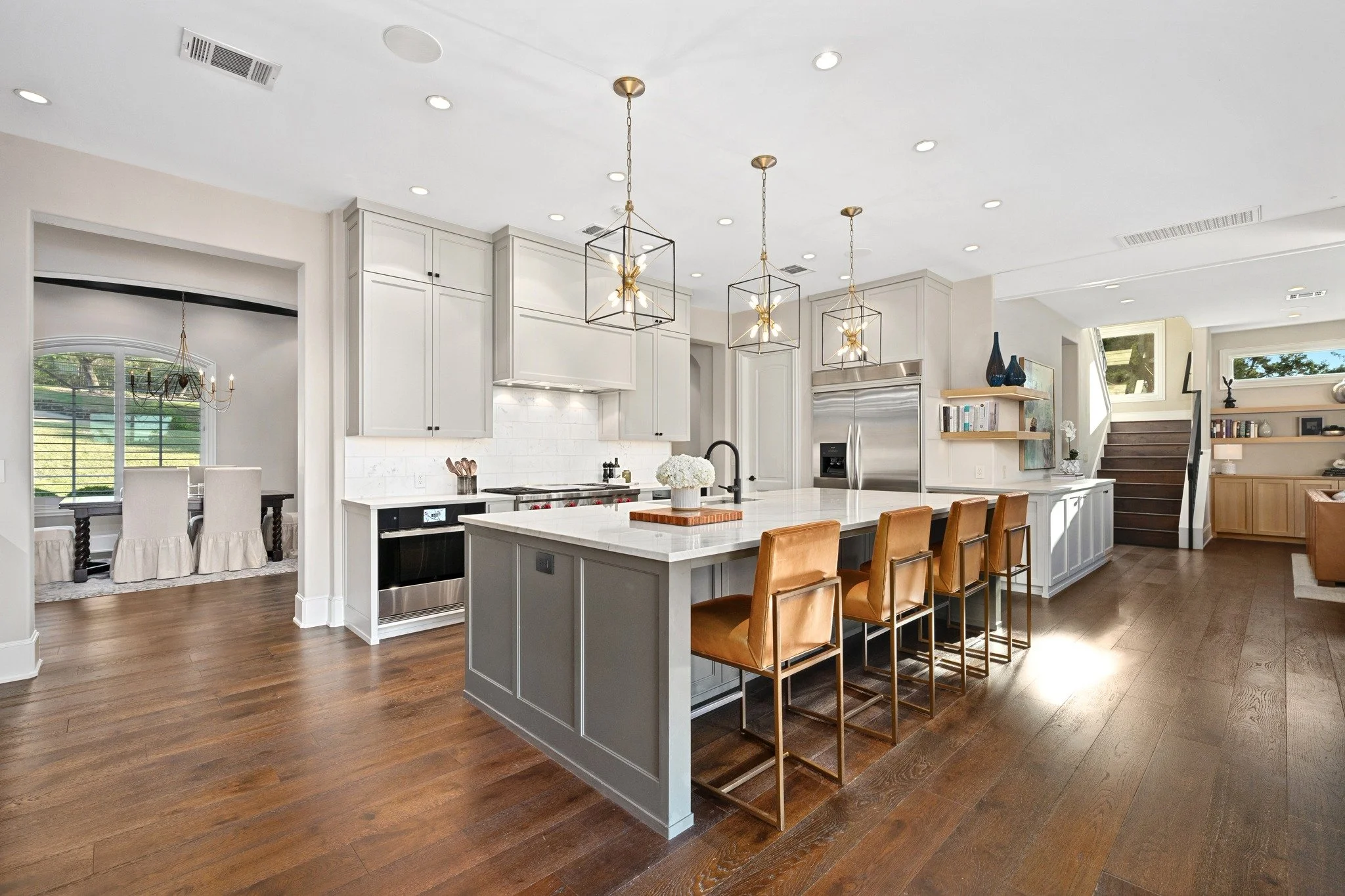 At the heart of the home, the kitchen, remodeled by Angela Vandewalle, has been thoughtfully expanded and refined with an oversized island, organized pantry, double ovens, microwave, warming drawer, smart appliances, and an easy connection to the surrounding gathering spaces. The adjoining living and dining areas are filled with natural light and create a sense of openness that makes the home feel both polished and inviting.