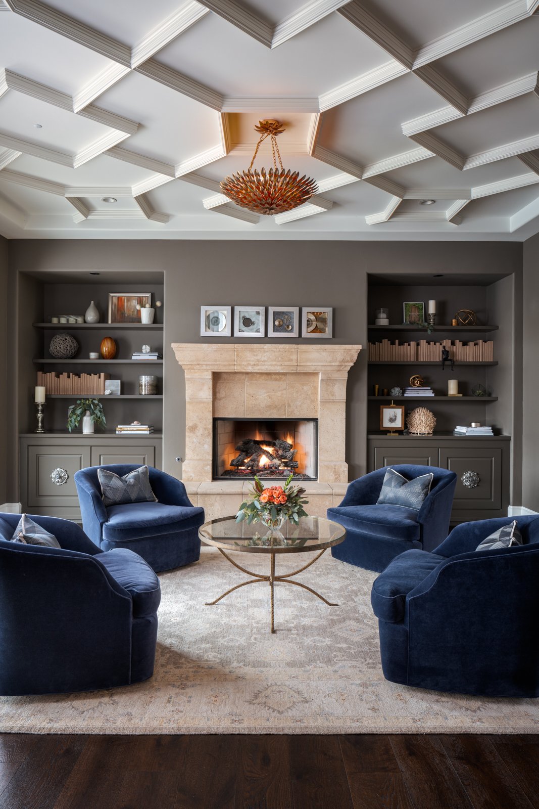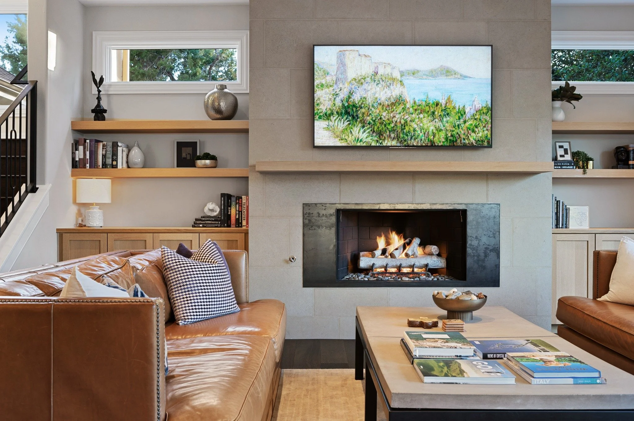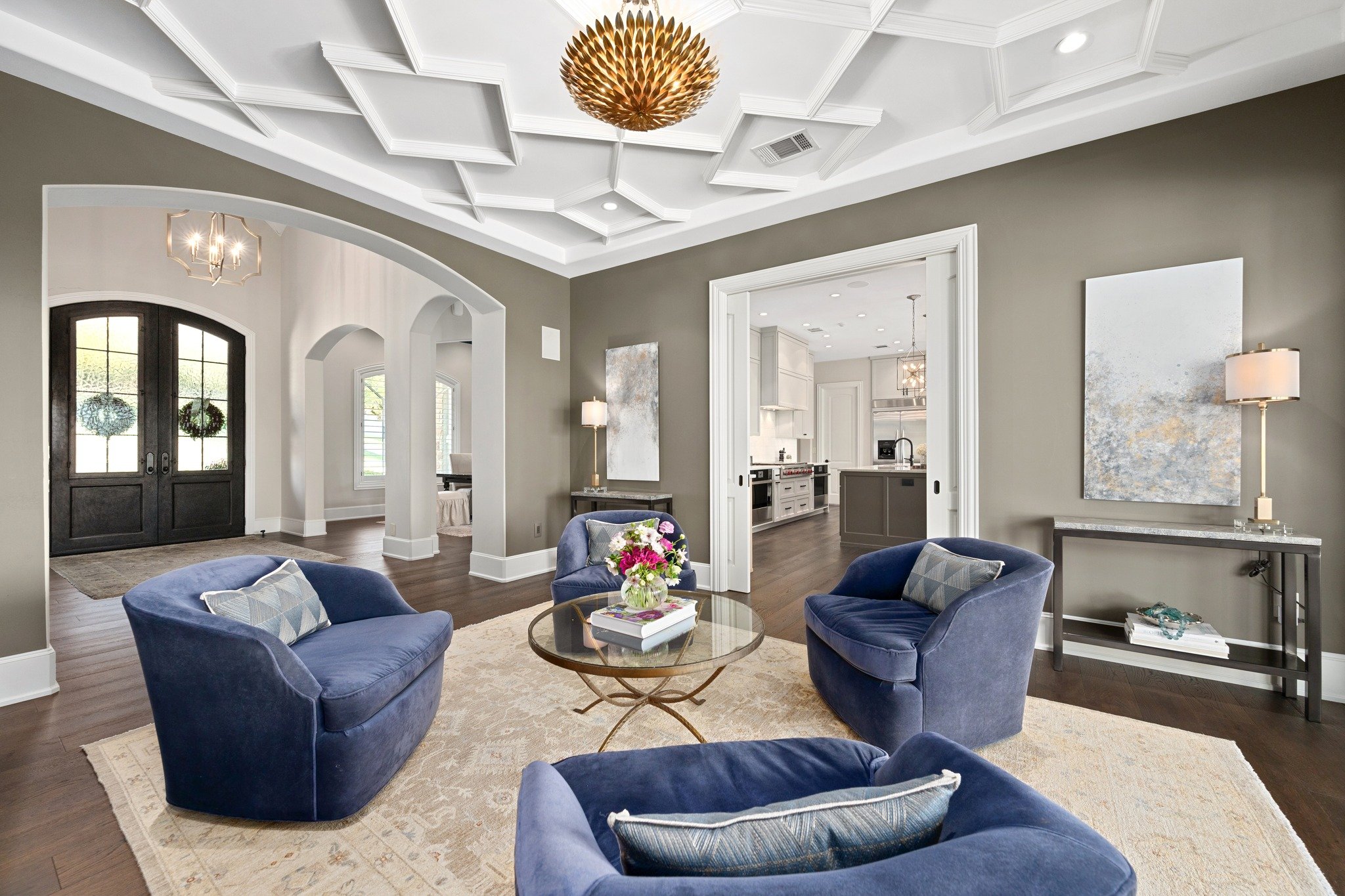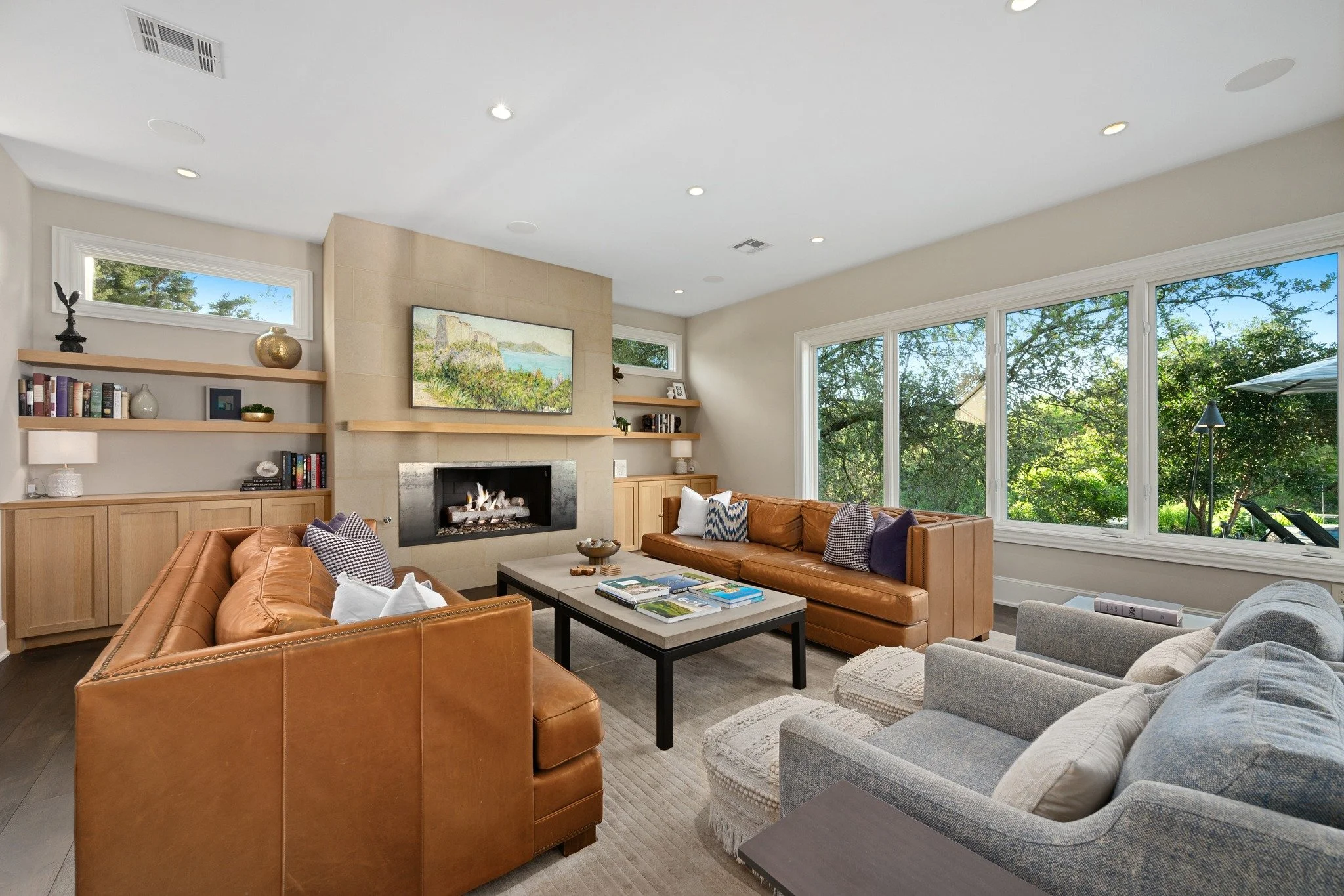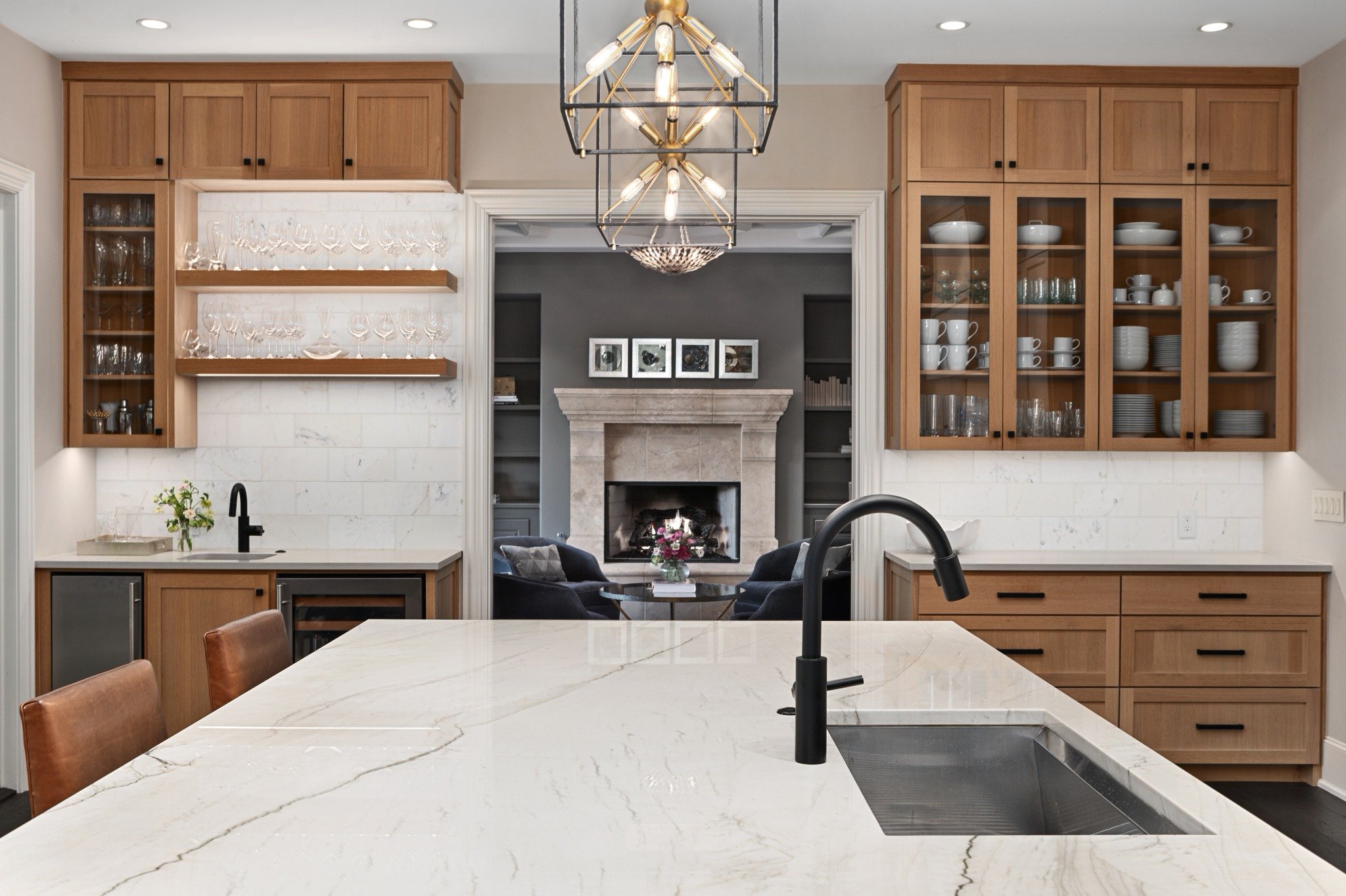 At the heart of the home, the kitchen, remodeled by Angela Vandewalle, has been thoughtfully expanded and refined with an oversized island, organized pantry, double ovens, microwave, warming drawer, smart appliances, and an easy connection to the surrounding gathering spaces. The adjoining living and dining areas are filled with natural light and create a sense of openness that makes the home feel both polished and inviting.