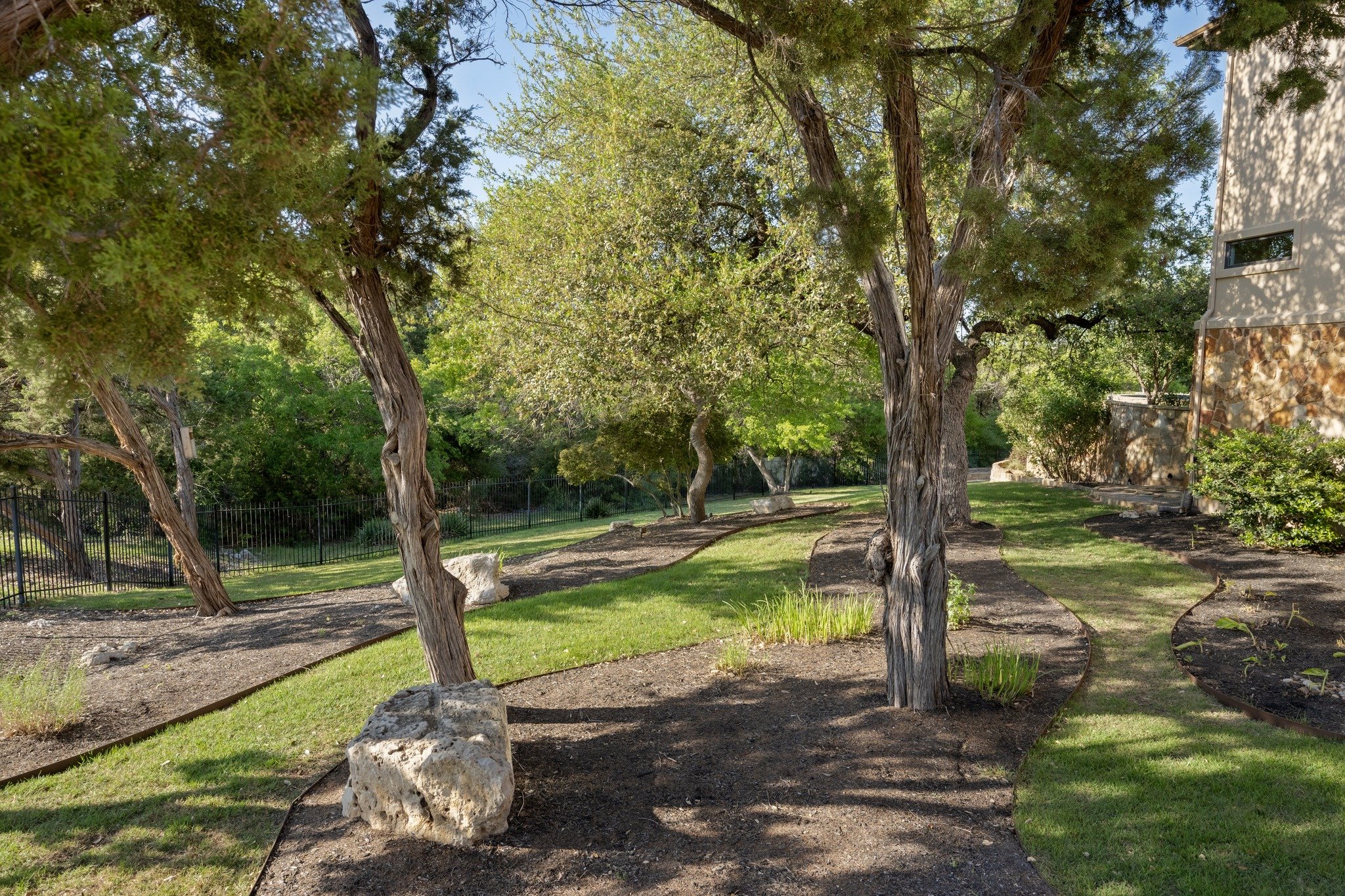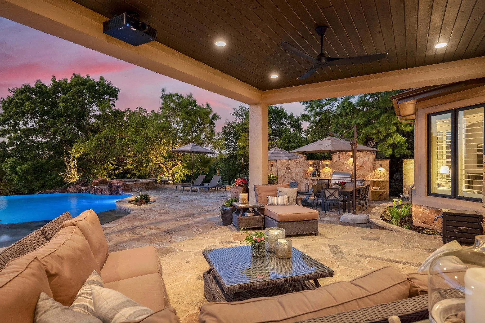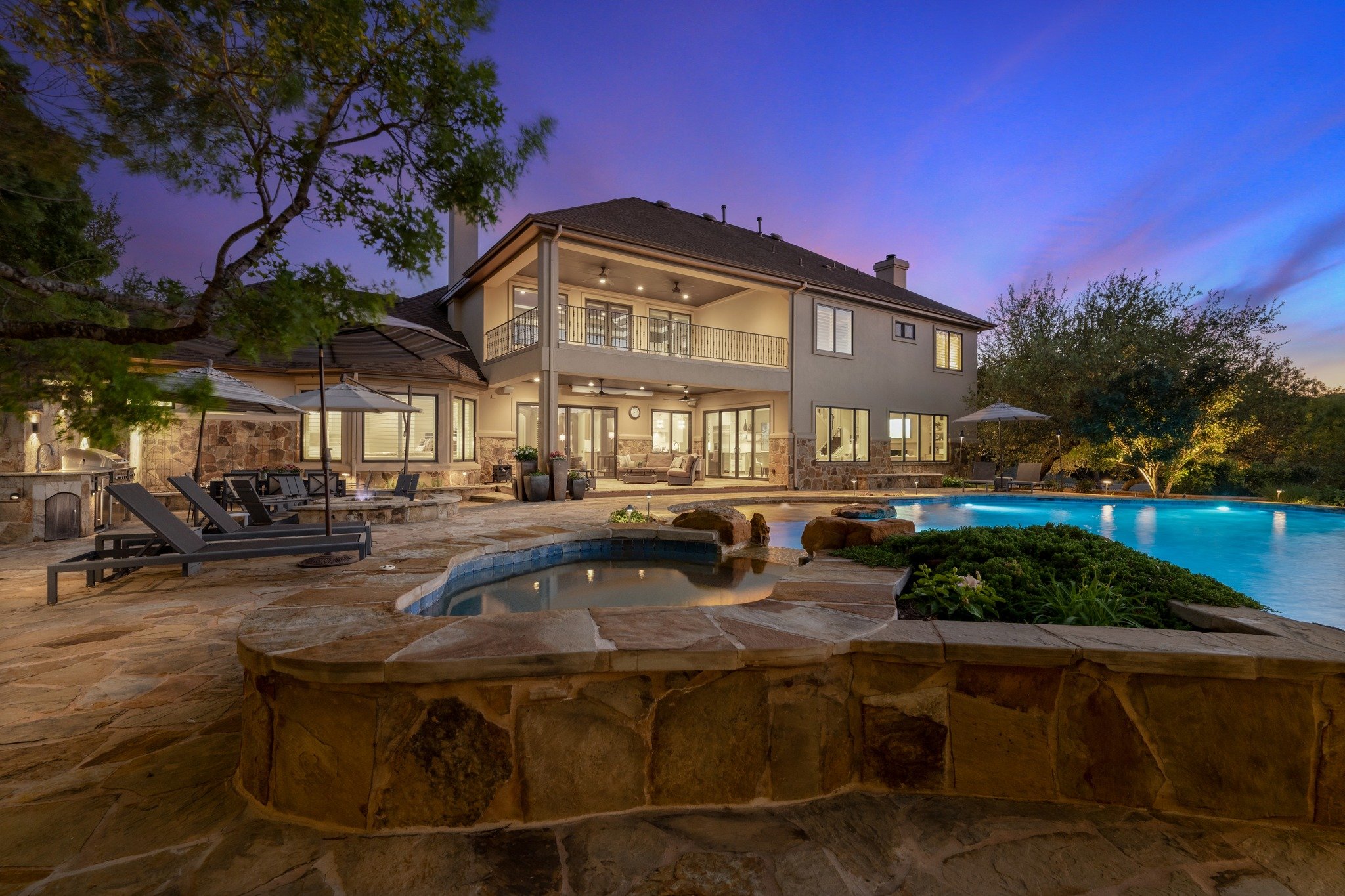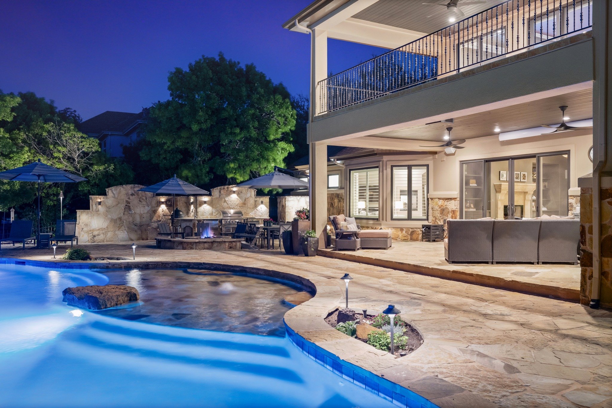 Outdoor living is equally compelling. A covered patio with projector, TV, integrated speakers, built-in grill, and Green Egg overlooks the resurfaced pool and spa, creating a setting designed for effortless entertaining. Beyond the pool, an expansive manicured lawn brings a rare amount of flat, usable green space to the backyard, ideal for play, gathering, or simply enjoying the setting. A separate fire pit area offers yet another place to gather, while mature landscaping and gated access to the neighboring reserve create a sense of privacy and expansiveness. Altogether, this home offers a rare sense of ease, privacy, and everyday comfort in one of Austin’s most desirable settings.