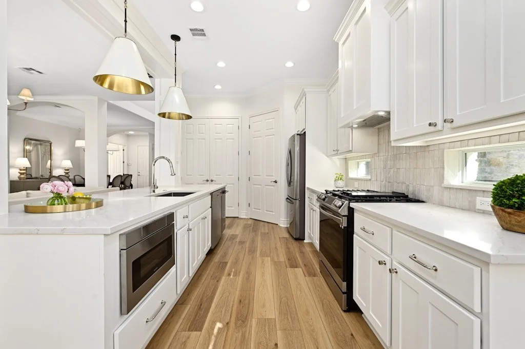 At the heart of the home lies the showstopping kitchen—a design lover’s dream. Anchored by a massive quartz island, it features a chic Clé Zellige hand-cut tile backsplash, a sleek new gas range, and dramatic pendant lighting, all complemented by an inviting eat-in breakfast bar. A formal dining room, perfect for hosting dinner parties or holiday gatherings, adds a refined touch to this already beautifully designed home.