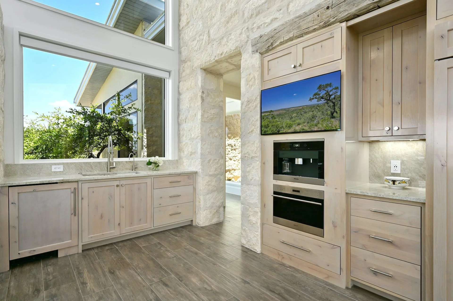 The main residence embraces the beauty of nature with its 360-degree views of the valley. Featuring two owner's suites and an inviting living room with a limestone-encased fireplace, the home bathes in natural light through its expansive windows. The kitchen is a chef's dream, complete with a built-in Sub-Zero refrigerator, Wolf range, Miele espresso machine, Wolf microwave, a large center island, dedicated veggie preparation area, and a brilliance-clear-cube ice machine. Enjoy unobstructed views of the remarkable vistas stretching out in every direction. The meticulously landscaped yard features a private hot tub, an inviting fire pit, and a covered outdoor patio, providing the ideal space for entertaining guests. The lush turf adds a touch of sustainable greenery to the surroundings, creating a tranquil ambiance that beckons you to unwind and savor the moment.